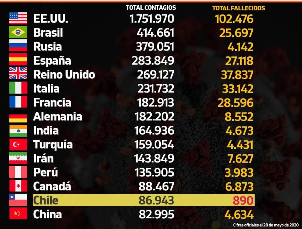 La lista es liderada por Estados Unidos con un millón 747 mil 867 casos seguido por Brasil con 414 mil 661. Entre los países que registran más muertes a causa de la infección se encuentra Estados Unidos con más de 100 mil fallecimientos seguido por Reino Unido e Italia con 37.460 y 33.142 muertes respectivamente.