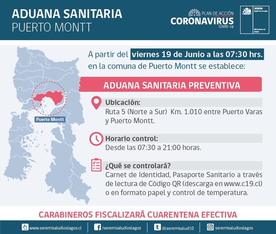 Debido a la alta movilidad entre las comunas de Puerto Montt y Puerto Varas y el aumento de contagio de Covid-19 en la capital regional, las autoridades regionales implementaron este punto de control en la tenencia de carreteras de la Ruta 5 cuyo inicio de funcionamiento será este viernes 19 de junio.