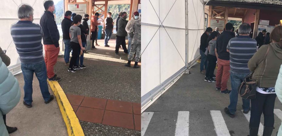 Muchas veces, vecinos han tenido que esperar bajo la lluvia poder ser atendidos y con una alta aglomeración de gente ya que los dos funcionarios que controlan no dan abasto con toda la gente que requiere ingresar a la comuna de Hualaihué.