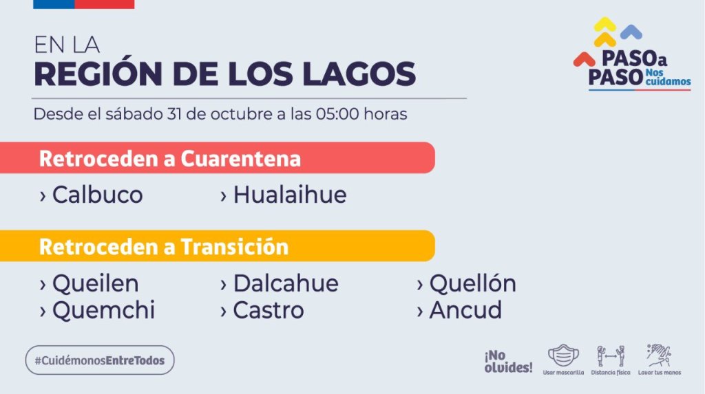 Además retrocedieron al paso 2 de Transición, el cual contempla cuarentena los fines de semana y festivos, las siguientes comunas de la provincia de Chiloé: Queilen, Quemchi, Dalcahue, Castro, Quellón y Ancud. Por otras parte, Maullín se mantiene en el paso 2 tras permanecer en cuarentena por tres semanas.