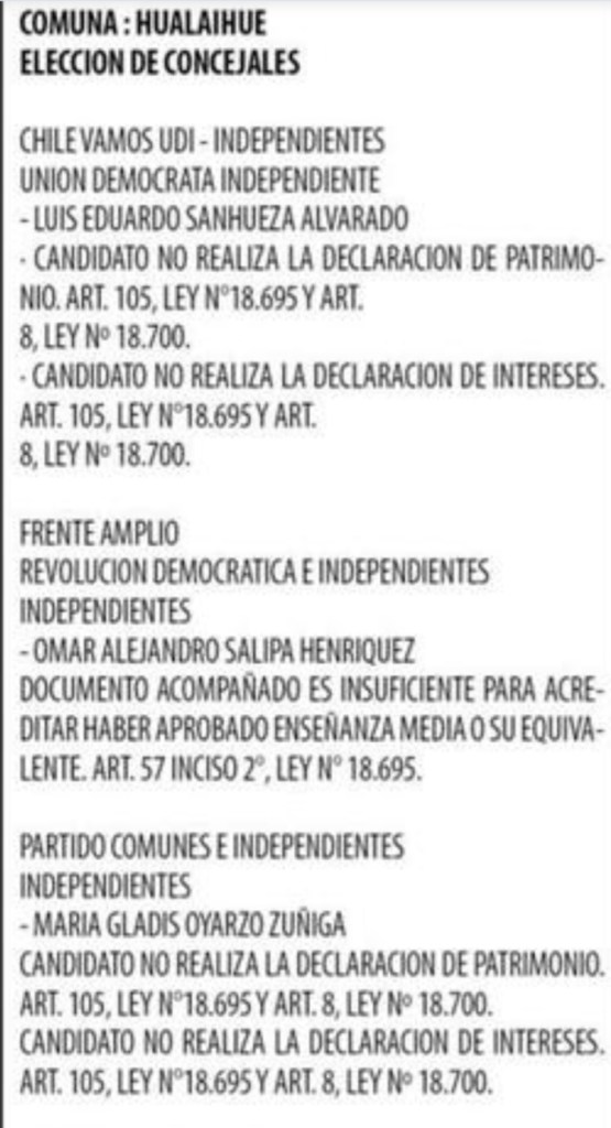 Este sábado 23 de enero de 2021 era la fecha esperada por los candidatos para saber si su candidatura era aceptada por el Servicio Electoral de Chile, de cara a las próximas elecciones Municipales del 11 de abril.