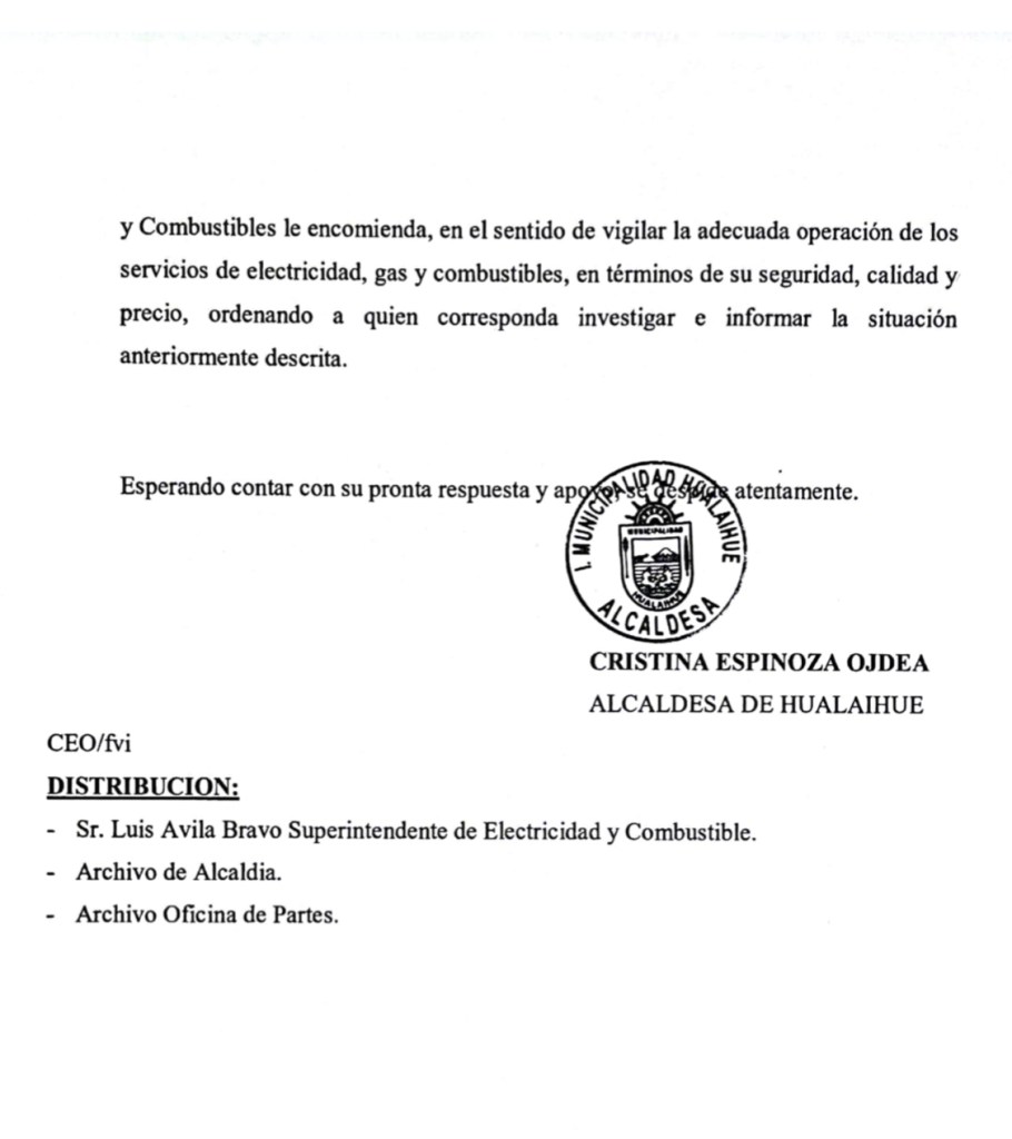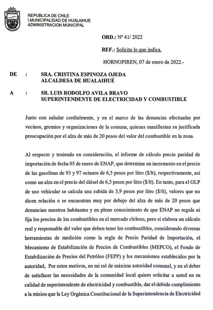 “Además, hemos oficiado a la Superintendencia de Electricidad y Combustibles para que fiscalicen esta alza de precios en Hualaihué y se puedan tomar las medidas necesarias para remediar esta situación”, indicó la Alcaldesa Cristina Espinoza Ojeda.