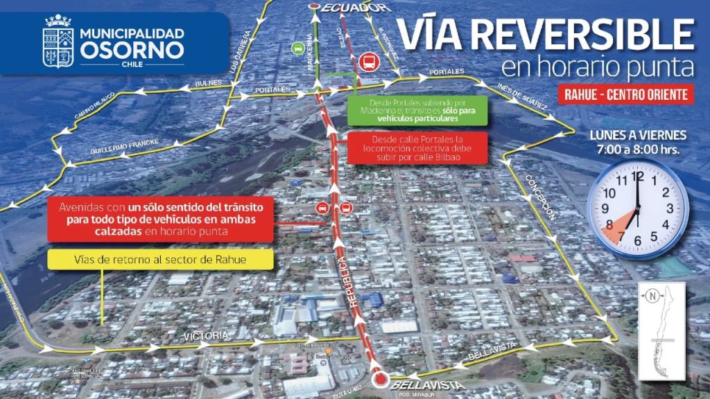 La reversibilidad considera avenida República, de poniente a oriente, desde calle Victoria Bellavista hasta el Puente San Pedro y avenida Mackenna Norte, de poniente a oriente, desde el Puente San Pedro hasta calle Ecuador. Asimismo, en el puente Chauracahuin sólo se transitará con dirección hacia calle Victoria, desde avenida Héroes de la Concepción hasta avenida República.