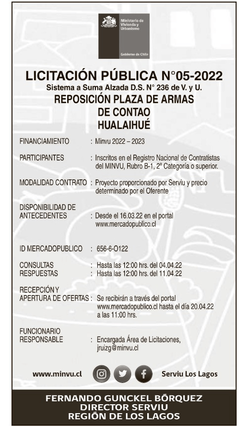 Este miércoles 16 de marzo, el Ministerio de Vivienda y Urbanismo publicó la licitación de la «Reposición de la Plaza de Armas de Contao, en la comuna de Hualaihué».