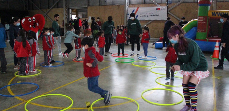Durante la mañana los estudiantes del Colegio Da Vinci School de Puerto Montt siguieron las rutinas de baile entretenido y participaron en los circuitos de motricidad y juegos habilitados en el gimnasio por el componente “Deporte en Espacios Públicos” del programa “Deporte de Participación Social” de Mindep IND.