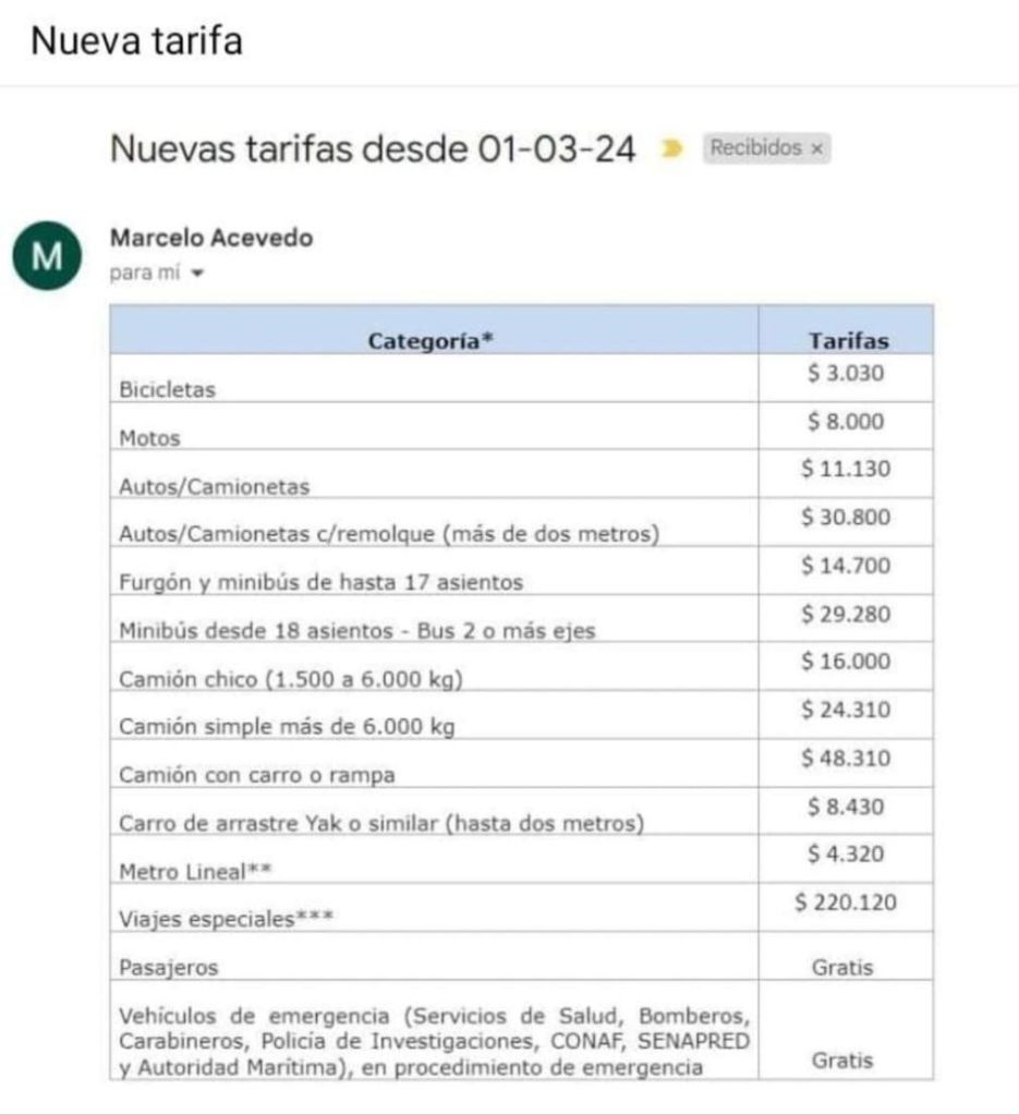 La Empresa Transportes del Estuario a cargo de la conectividad entre caletas La Arena y Puelche anunció el aumento de sus tarifas a contar del 1 de marzo de 2024.