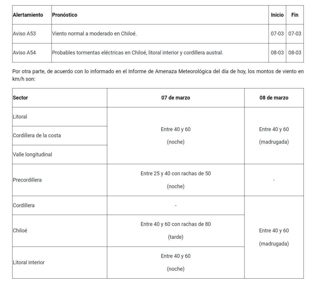 En consideración a estos antecedentes que suponen un aumento del riesgo asociado a dichas variables y en coordinación con la Delegación Presidencial Regional de Los Lagos, la Dirección Regional del SENAPRED declara Alerta Temprana Preventiva Regional, por Evento Meteorológico, vigente desde hoy y hasta que las condiciones del evento así lo ameriten.