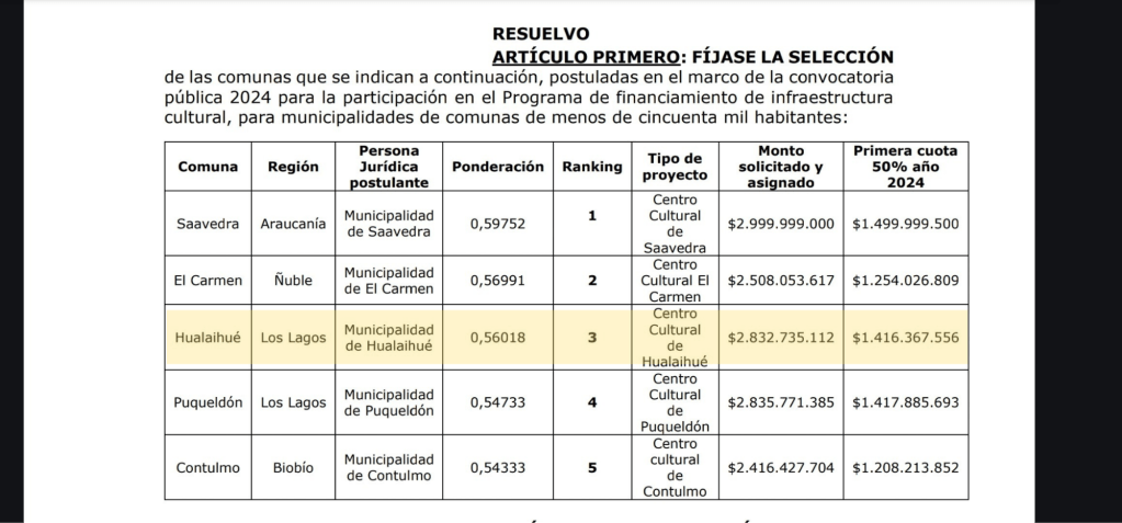 Este viernes 13 de septiembre, la Alcaldesa Cristina Espinoza Ojeda anunció una excelente noticia para la comuna de Hualaihué: el Ministerio de las Culturas, las Artes y el Patrimonio confirmó el financiamiento para la construcción del tan esperado Centro Cultural, por un monto de $2.832 millones.
