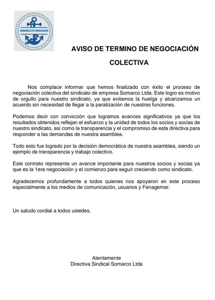 El sindicato agradeció el apoyo recibido durante este proceso, especialmente a los medios de comunicación, usuarios y a Fenagemar, quienes jugaron un rol clave en la concreción de este acuerdo.