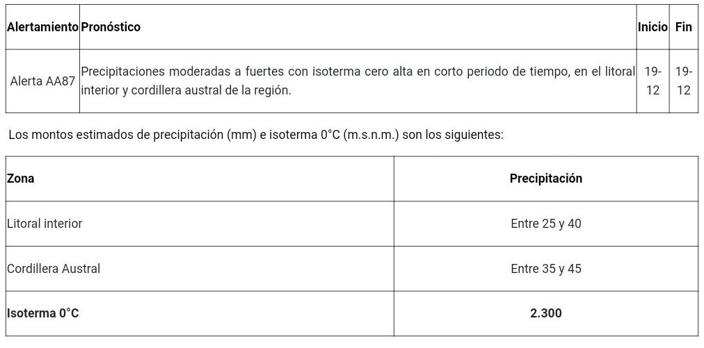 En consideración a este antecedente y en coordinación con la Delegación Presidencial Regional de Los Lagos, la Dirección Regional del SENAPRED declara Alerta Temprana Preventiva por precipitaciones para las provincias de Llanquihue y Palena, vigente desde hoy y hasta que las condiciones así lo ameriten.