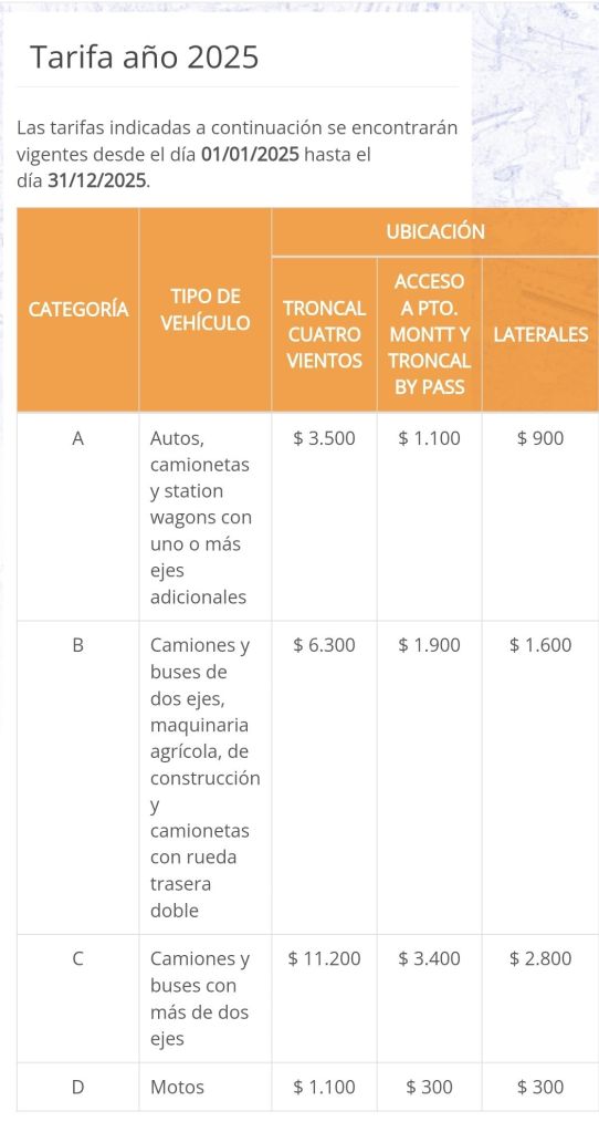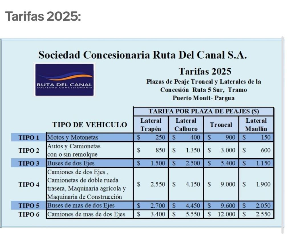 A partir del 1 de enero de 2025, las tarifas de los peajes en la región de Los Lagos tendrán un incremento, según lo informado por las concesionarias a cargo de las rutas de la zona.