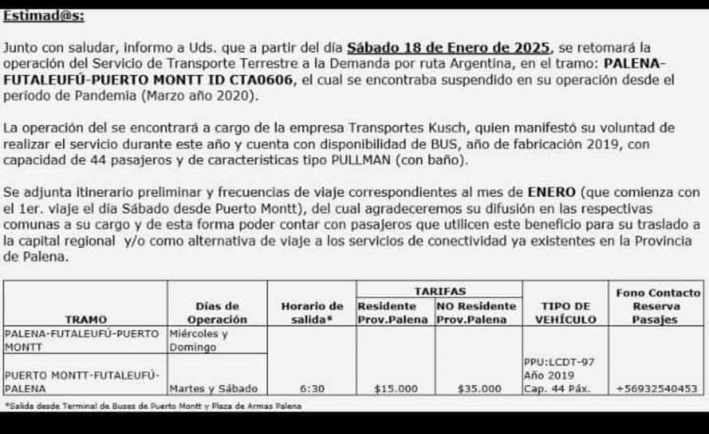 Junto con saludar, informo a ustedes que a partir del sábado 18 de enero de 2025 se retomará la operación del Servicio de Transporte Terrestre a la Demanda por la ruta Argentina, en el tramo Palena – Futaleufú – Puerto Montt (ID CTA0606), el cual se encontraba suspendido desde el inicio de la pandemia (marzo de 2020).