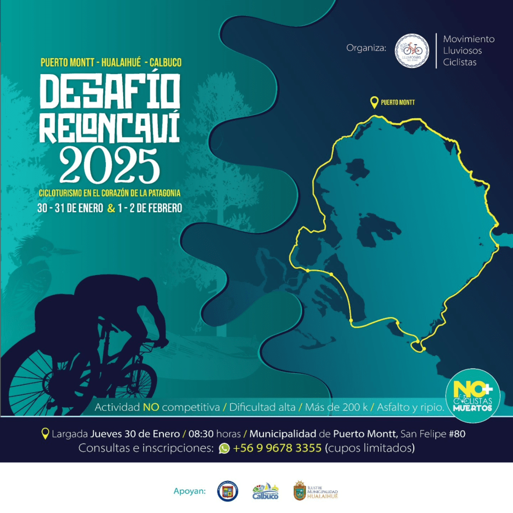 La iniciativa, organizada por el Movimiento Lluviosos Ciclistas, cuenta con el patrocinio de Sernatur, el apoyo de las municipalidades de Puerto Montt, Hualaihué y Calbuco y el auspicio de empresas de la Región de Los Lagos.