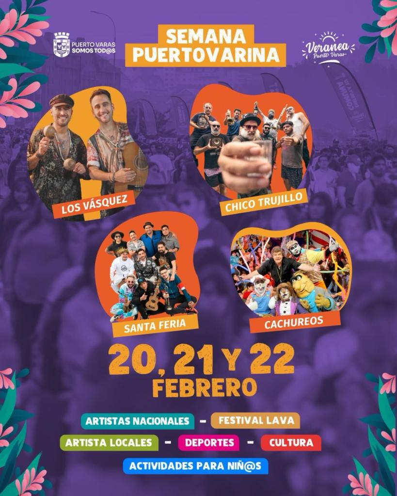 Desde el Municipio explicaron que, para esta ocasión, “tendremos en nuestra comuna a Los Vázquez, a Santa Feria, a Chico Trujillo y a Cachureos para nuestros niños y niñas. También contaremos con el Festival Lava para así incentivar e impulsar la trayectoria de jóvenes músicos de nuestra comunidad. Espacios culturales abiertos a toda nuestra comuna. Lo que queremos es que este sea un festival de carácter familiar, comunitario, que ocurrirá el 20, 21 y 22 de febrero en nuestra costanera. Así que todos y todas invitadas a poder disfrutar de esta nueva versión de la Semana Puertovarina que estamos organizando con mucho cariño para todos ustedes”.